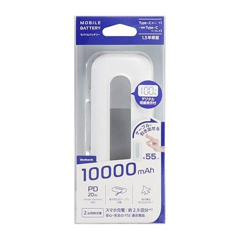 オウルテック(OWLTECH) OWL-LPB10021CR-WH ホワイト 巻き取り式ケーブル内蔵 10000mAh 最大PD20W対応 USB Type-C入出力 モバイルバッテリー