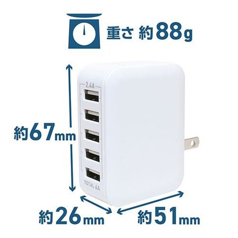 定格出力:出力:5V/6000mA(6A)5ポート合計