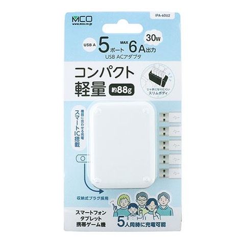 ミヨシ IPA-60U2/WH ホワイト 5V6A対応 USB-ACアダプタ 5ポートタイプ
