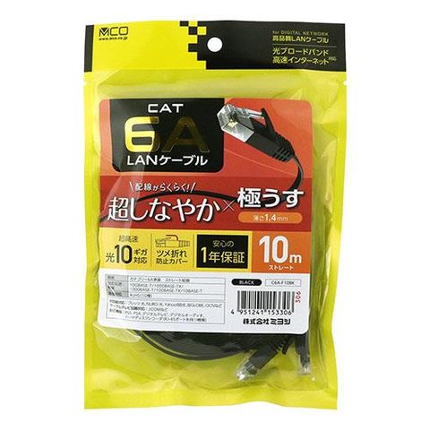 ミヨシ C6A-F10BK ブラック カテゴリー6A 極うすLANケーブル 10m