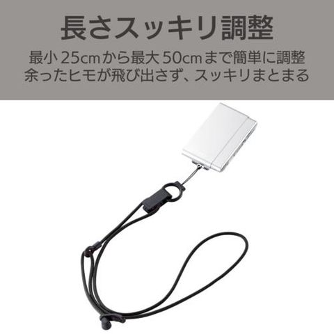 ■長さ調節スライダーを上下にスライドさせるだけで、最小50cmから最大100cmまで、ストラップの長さを簡単に調節可能です。