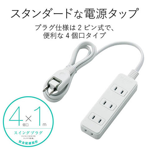エレコム(ELECOM) T-TS02-2410WH ホワイト 電源タップ 180度スイングプラグ 延長コード 2ピン 4個口 1m