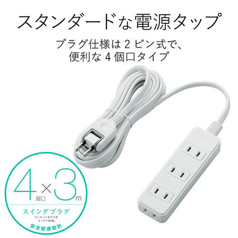 エレコム(ELECOM) T-TS02-2430WH ホワイト 電源タップ 180度スイングプラグ 延長コード 2ピン 4個口 3m