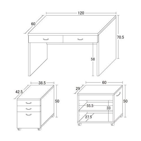 商品詳細サイズ:【デスク】引出内寸:(2杯)約W52.5×D33.5×H6(6.5)cm 側板厚み:約3cm 天板厚み:約2.3cm、【チェスト】引出内寸:(小2杯)約W31.5×D30.5×H5cm (大1杯)約W31.5×D30.5×H15(21.5)cm、【ラック】引出内寸:約W52.5×D23.5×H5(6.5)cm 空間内寸:約W55.5×D27.5×H33cm(可動棚1枚付、6.6cmピッチで4ヶ所移動) キャスター(ストッパーなし)は、チェスト5ヶ付、ラック4ヶ付