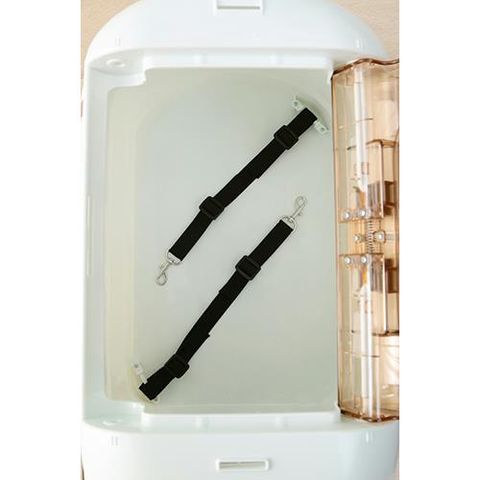 素材:本体・ハンドル・シートベルトフック:ポリプロピレン、天面扉:ポリカーボネート、扉レバー・バックル:ABS樹脂、線材:スチール