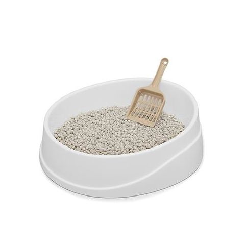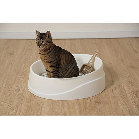■台形型で倒れにくい構造のオープンタイプの猫トイレです。側面に波型のモチーフをあしらいました。手を入れられるスペースがあり、トイレの持ち運び、お掃除の際に大変便利です。銀イオンを配合しているので、臭いの元となる真の発生を抑制します。後始末に便利なスコップ付きです。