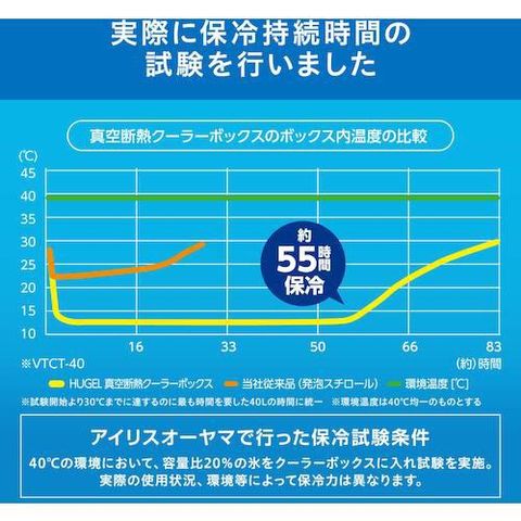 ■保冷力が高く、特に全面に真空断熱パネルを使用しているので、約40℃の環境下において約55時間保冷状態を保てるため、長時間のアウトドアシーンにも適しています。
