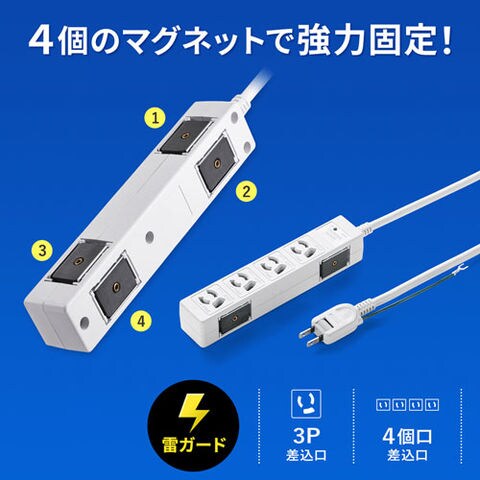 サンワサプライ TAP-SPWMG34-3 雷ガードタップ 3P 4個口 3m マグネット付き
