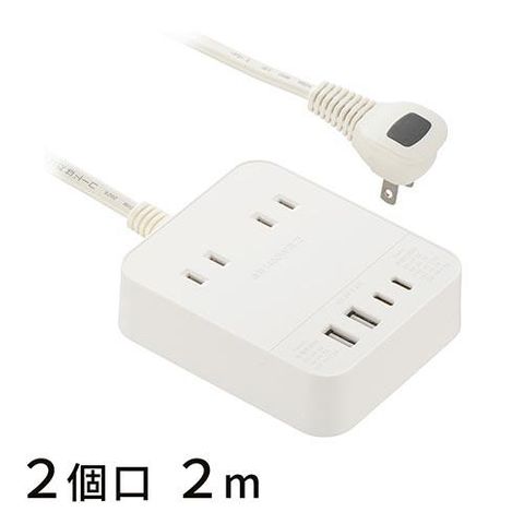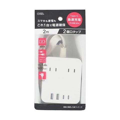 オーム電機(OHM) HS-T22U4W25 2個口タップ PD対応30W 2m 白