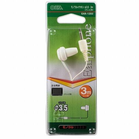オーム電機(OHM) EAR-1202 モノラルイヤホン テレビ用 3.5 3m ホワイト 01-1202