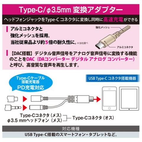 オーム電機(OHM) SMT-P7318-N ゴールド AudioComm 変換アダプター Type-C 3.5mm PD対応 高耐久 01-7318