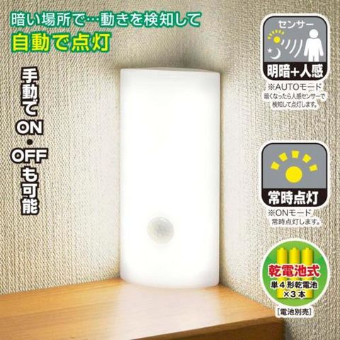 乾電池の寿命(アルカリ乾電池使用の場合の目安):AUTOモードで1日10回点灯の場合は約6か月、ONモードで約7時間連続点灯