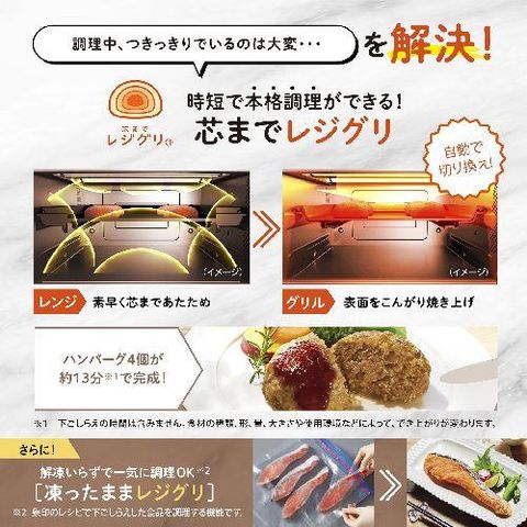 ■レンジ機能で食材の中まで加熱し、その後は自動でグリル機能に切り換えて表面に焼き色をつけます。
