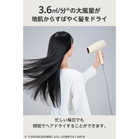 ■大風量の3.6m3/分(※)で、髪をすばやく乾かせます。忙しい毎日でも時短でヘアドライができます。 ※TURBO使用時 自社測定による ※JIS規格では1.8m3/分