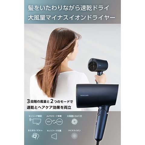 テスコム(TESCOM) TD713A-A ネイビー ドライヤー 大風量 速乾 温度センサー 熱ダメージ配慮 マイナスイオン 1300W 折りたたみ クールショット