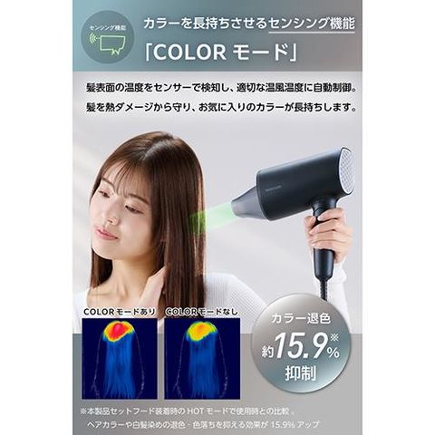 ■速乾とヘアケア効果の両立を実現。大風量2.0m3/分(※)の風で速乾ドライやモード変更でいたわりドライなど、モードや付属のセットフードを組み合わせてシーンによって使い分け。3段階の風量と2つのモードでお好みの使い方を選べます。 ※TURBO時 JIS規格測定法による