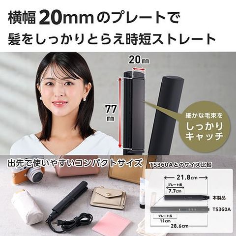 ■コンパクトでも髪をしっかりとらえる横幅20mmのプレートで時短ストレート。ストレートはもちろん、毛先ワンカールもできます。トップ立ち上げ、寝癖直しや毛先のニュアンスカールなどにもおすすめです。