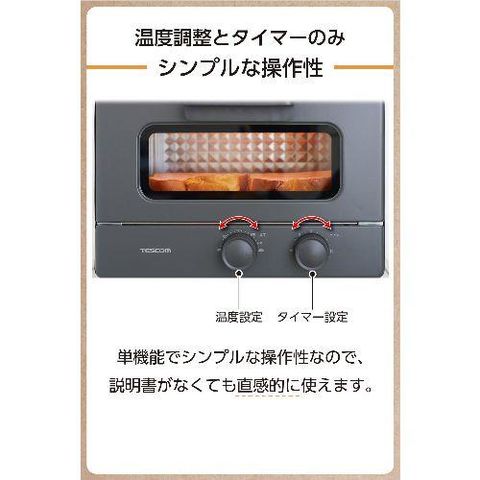 テスコム(TESCOM) TSB51A-K ブラック トースター 2枚焼き オーブントースター コンパクト 無段階温度調節 1000W タイマー15分 一人暮らし向け
