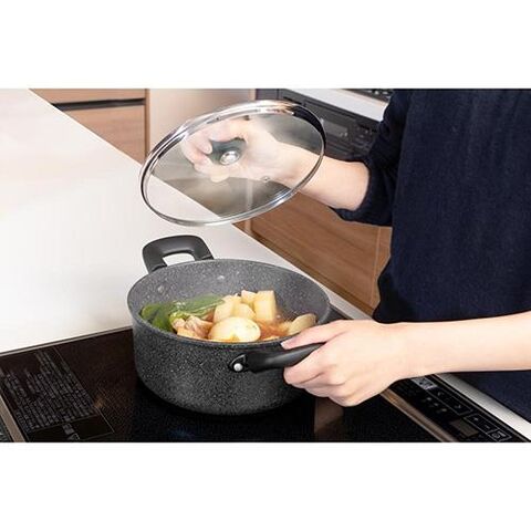 素材・材質:本体/アルミニウム合金、はり底/ステンレス鋼(クロム16%)(底厚2.7mmはり底含む)(24cmは3mm)、ハンドル・ツマミ/フェノール樹脂(耐熱温度150℃)、ナイロン(耐熱温度100℃)、ガラス蓋/全面物理強化ガラス、内面/ふっ素樹脂塗膜加工、外面/マーブル調焼付塗装