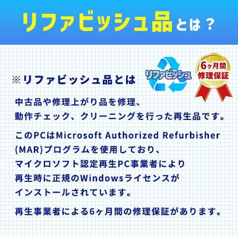 このPCはMicrosoft Authorized Refurbisher(MAR)プログラムを使用しており、マイクロソフト認定再生PC事業者により再生時に正規のWindowsライセンスがインストールされています