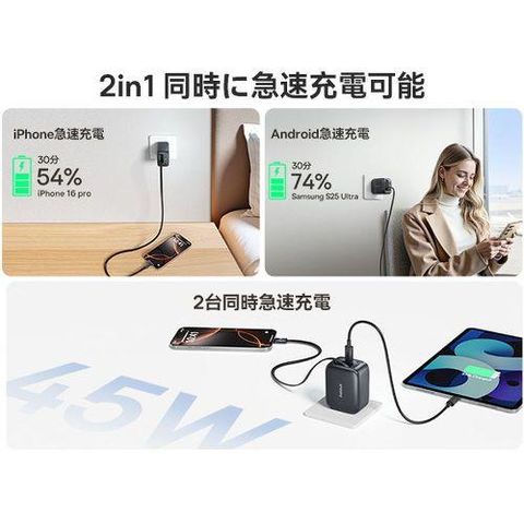 ■45W急速充電。80cmのケーブル内蔵。USB-C端子搭載。充電器とケーブルを別々に持ち歩く必要もありません。