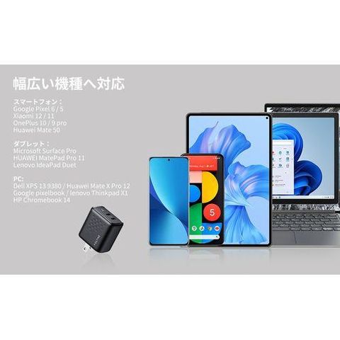 USB Power Delivery(PD)対応の45W出力を備え、iPhone、Android等のスマートフォンのみならず、タブレットやMacBook Air M1等のPCへ充電が可能です