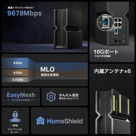 ■9.7GbpsトライバンドWi-Fi:Wi-Fi 7によって6GHzのチャンネル幅が320MHzまで拡張され、最大9.7Gbpsの高速通信が可能になったことで、よりスムーズな8Kストリーミングや超高速ダウンロードを楽しむことができます。