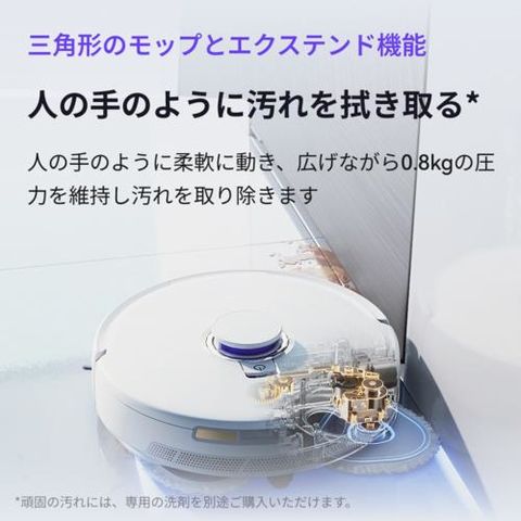 独自開発のバイオメカニカルモップは、従来の可動式モップの弱点である「圧力の弱さ」を克服。8N(約0.8kg)という圧力で人の手のような力強さで床をキレイに水拭きします。