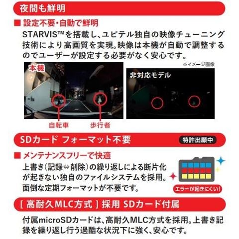 STARVISを搭載し、ユピテル独自の映像チューニング技術により高画質を実現。映像は本機が自動で調整するのでユーザーが設定する必要がなく安心です。