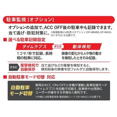 記録方式:常時録画/イベント記録(Gセンサー、ワンタッチ)/駐車監視(タイムラプス、動体検知、Gセンサー)