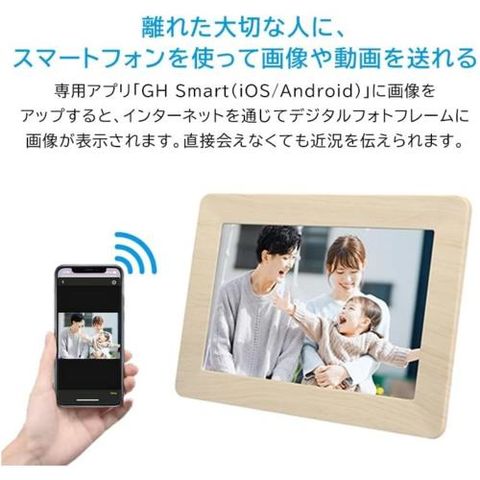 専用アプリ「GH Smart(iOS/Android)」に画像をアップすると、インターネットを通じてデジタルフォトフレームに画像が表示されます。