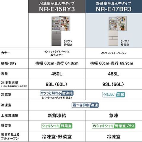 【標準設置料金込】【長期保証付】パナソニック(Panasonic) NR-E47BR3-C マットライトベージュ 冷凍冷蔵庫 野菜室が真ん中 468L 右開き 幅60cm