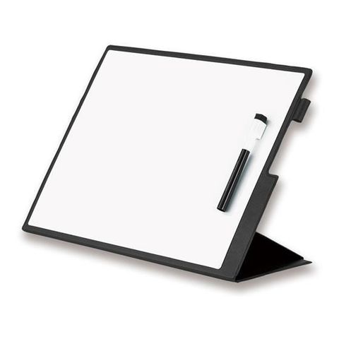 ボード面マグネット使用可●本体寸法:幅410×奥行7×高さ600mm(開いた状態)●ボード面寸法:幅370×高さ280mm●質量(約):800g●材質:ボード面/ソフト鉄板・PET、カバー/PU・再生紙・磁石・鉄板、マーカー/PP・フェルト・アルコール系インク●付属品:イレーサー付きマーカー(黒)