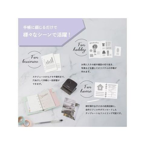 システム手帳のリフィルが簡単につくれる穴あけパンチです。ゲージとパンチの2つを使い、「A5サイズ6穴」「バイブルサイズ6穴」「ミニサイズ6穴」「マイクロ5サイズ5穴」の4サイズに対応。プリントアウトした資料や配布資料など、既存の用紙をシステム手帳に綴じることができます。