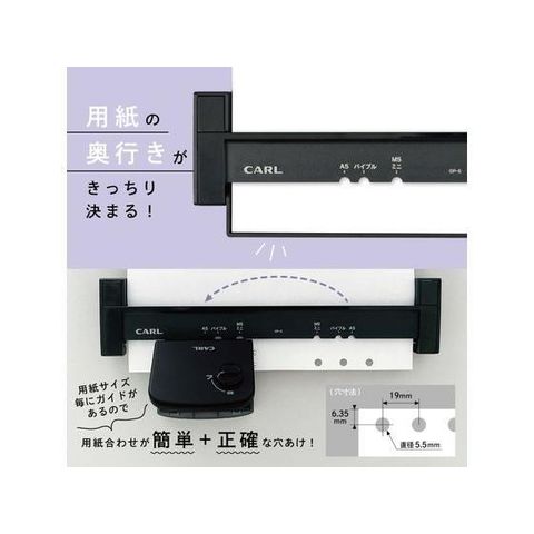 ●穴あけ枚数:5枚(コピー用紙)●穴径:5.5mm●穴間隔:19mm●穴奥行:6.35mm(用紙端から穴の中心)●対応用紙サイズ:A5サイズ6穴、バイブルサイズ6穴、ミニサイズ6穴、マイクロ5サイズ5穴●サイズ:パンチ/幅73×奥行68×63mm(ロック時の高さ41mm)、ゲージ/幅247×奥行71×高さ13mm●重量:パンチ/205g、ゲージ/90g●ハンドルロック付き●注文単位:1個※メーカーの都合により、パッケージ・仕様等は予告なく変更になる場合がございます。