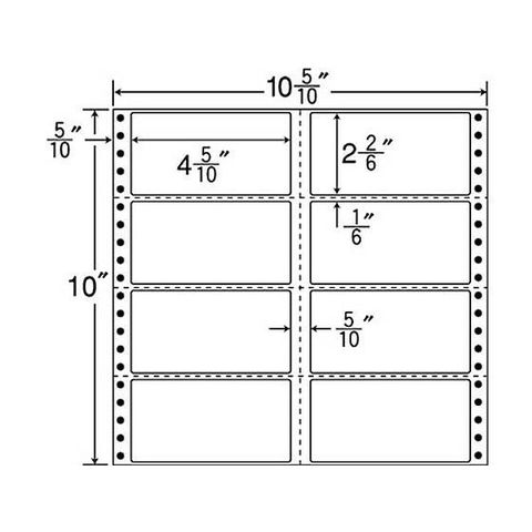 ●シートサイズ:幅267×縦254mm(Y10 5/10×T10インチ)●ラベルサイズ:幅114×縦59mm(Y4 5/10×T2 2/6インチ)●8面付(2列×4段)●入数:500折●ヨコ3本・タテ1本ミシン目入り●ドットインパクトプリンタ対応