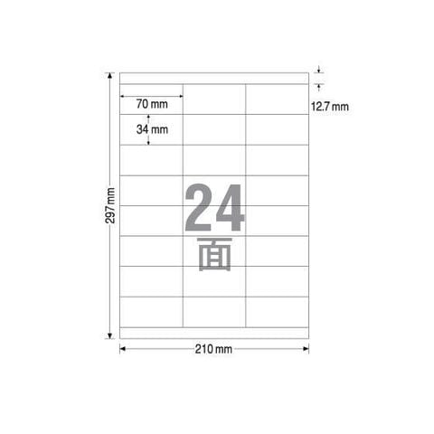●総厚み:165μm●ラベル厚:88μm●サイズ:A4(210×297mm)●仕様:24面上下余白付●注文単位:1箱(500シート)●ラベルサイズ横70×縦34mm●白色度:約95%●適応プリンタ:カラーレーザー、モノクロレーザー、カラーコピー、モノクロコピー、カラーインクジェット●各メーカー対応品番:エーワン/L24AM500、72324、31540、NANA/LDZ24U、コクヨ/KPC-E1241-20、KPC-E1241-100