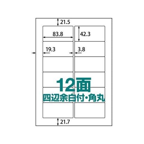 ●仕様:12面四辺余白付・角丸●ラベルサイズ:83.8×42.3mm●坪量:147g/m2●紙厚:0.14mm●ラベル厚:0.08mm(80ミクロン)●ISO白色度:90%●サイズ:A4●ラベルをはがしやすい楽貼加工●適応プリンタ:マルチ対応(インクジェット、レーザープリンタ/コピー機)●注文単位:1箱(500シート)●各メーカー対応品番:エーワン/L12BM500、72312、28844、NANA/LDW12PG、ヒサゴ/ELM007、OP861、GB861