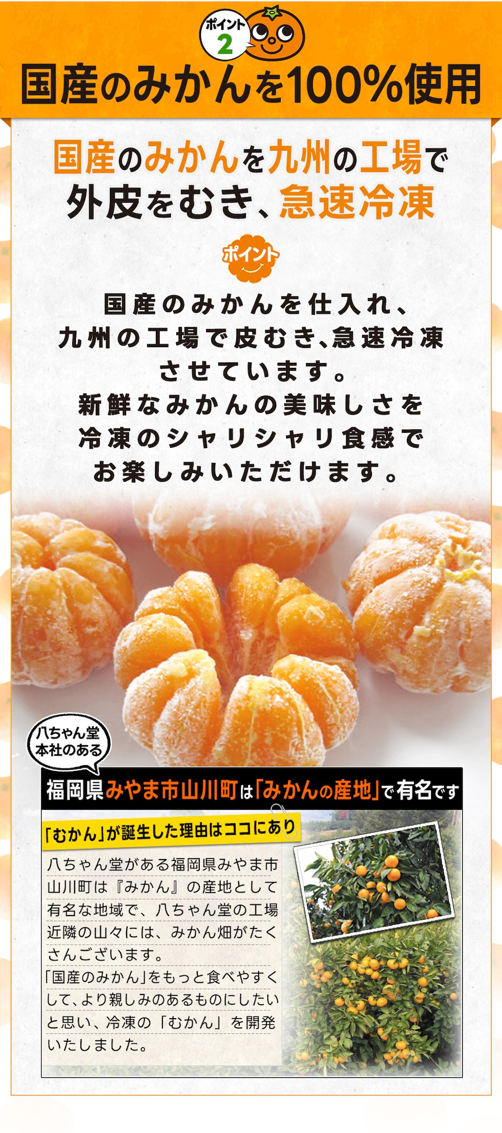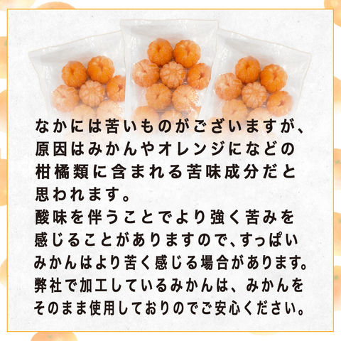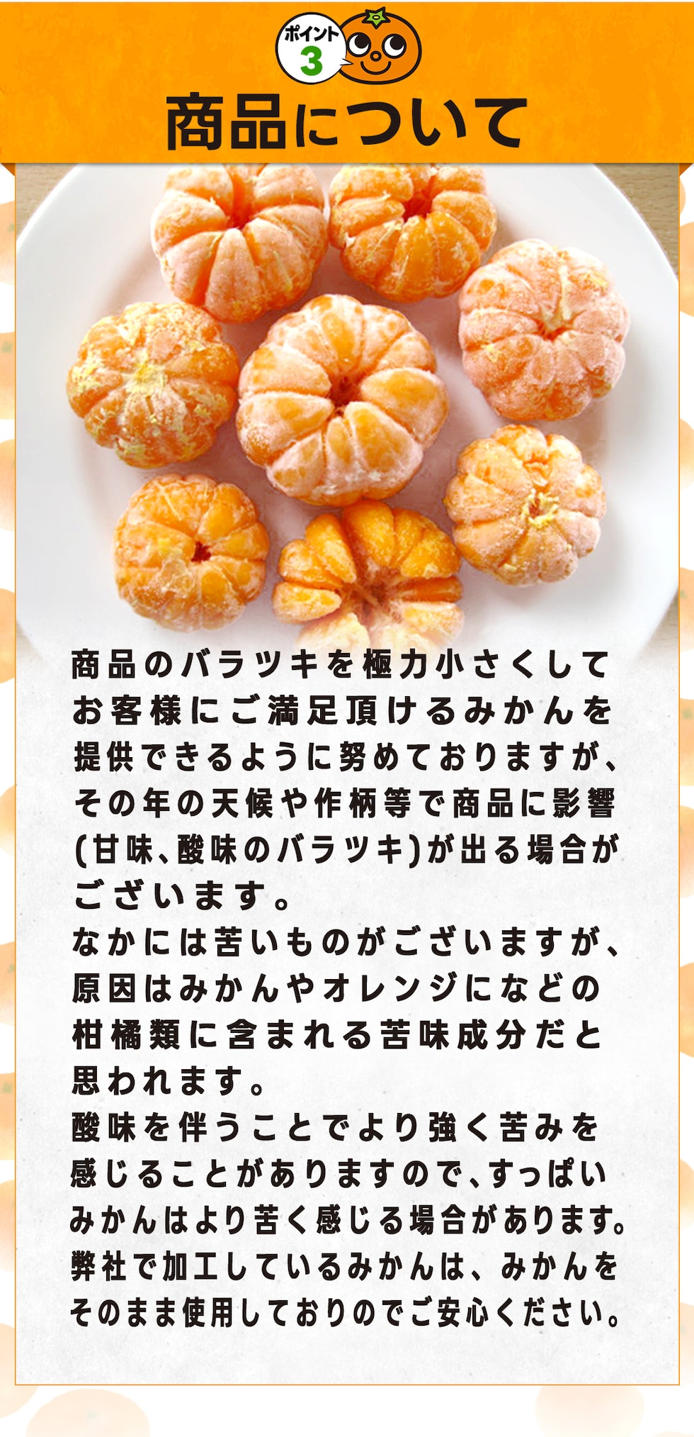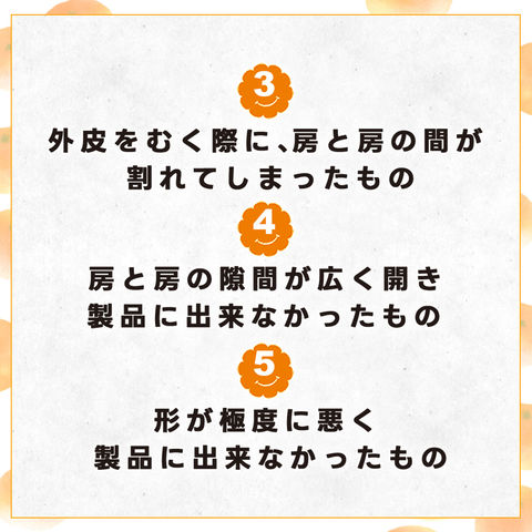 | 大きすぎたり、小さすぎたりで製品規格外になったもの、皮をむく際に薄皮が大きく破れてしまったもの、皮をむく際に房と房の間が割れてしまったもの、房と房の隙間が広く開き製品に出来なかったもの、形が極度に悪く製品に出来なかったむかんを「わけありむかん」として販売しています。原材料のみかんは国産のみかんを使用し糖度にこだわりました。 |