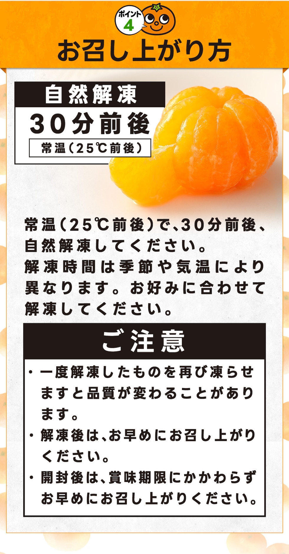 常温で、約30分間自然解凍してください。 解凍時間は目安です。お好みに合わせて解凍してくだささい。 |