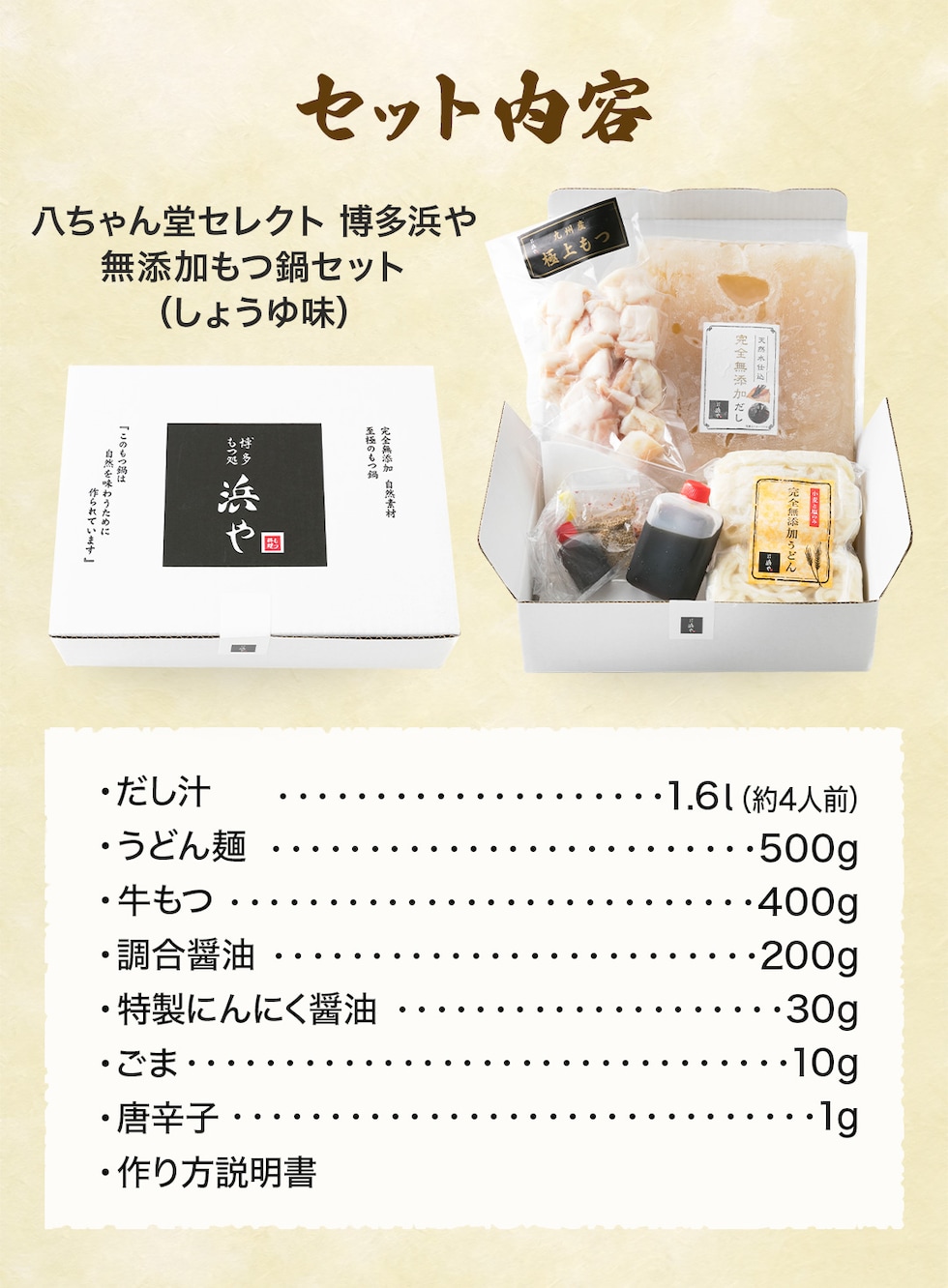 【八ちゃん堂】 博多 もつ鍋 2点セット (1セットあたり2人前) 送料込み【沖縄県は別途送料2,020円】 醤油 博多もつ処 浜や もつ うどん 牛もつ 無添加 冷凍 冷凍食品 国産 惣菜 お歳暮