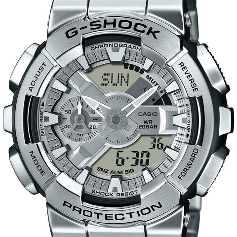 そのアイコニックなスタイルで人気モデルのひとつであるビッグケースのアナログ・デジタルコンビネーション、「110シリーズ」のベゼルとバンドを金属素材にアップデートしたGM-110です。