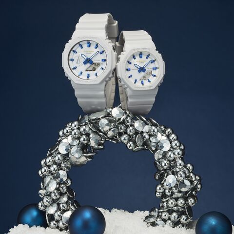 恋人たちに贈るクリスマス限定ペア「Gプレゼンツラバーズコレクション」より、2025年のクリスマスシーズンを彩るスペシャルモデルです。スタイリッシュなデザインが人気のGA-2100、GMA-P2100をベースモデルに、クリスマスツリーのオーナメントをイメージしたホワイト×ブルーの爽やかで、普段使いできるデザインに仕上げました。