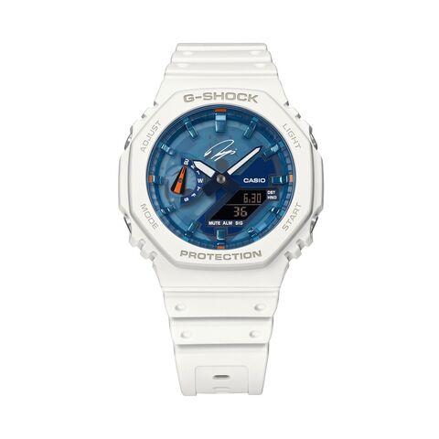 1983年の発売以来、飽くなき強さを求めて進化を続けるタフネスウオッチG-SHOCKから、CASIO所属、プロゴルファー石川遼選手のシグネチャーモデル第5弾です。ベースモデルはオクタゴンベゼルのGA-2100で、ゴルフスイング中も邪魔にならない薄型ケースを採用。文字板には闘志を秘めた冷静のブルー、全体は潔さと覚悟を表すホワイト、差し色には希望を意味するオレンジを配色し、どんなゴルフウェアにも合わせやすいカラーリングに仕上げました。また、文字板はスケルトンを採用することで、今までにない印象的なデザインとなっています。石川遼選手のサインを12時位置と裏蓋に施し、トレーディングカードが付属したスペシャルパッケージと合わせ、特別な仕様となっています。