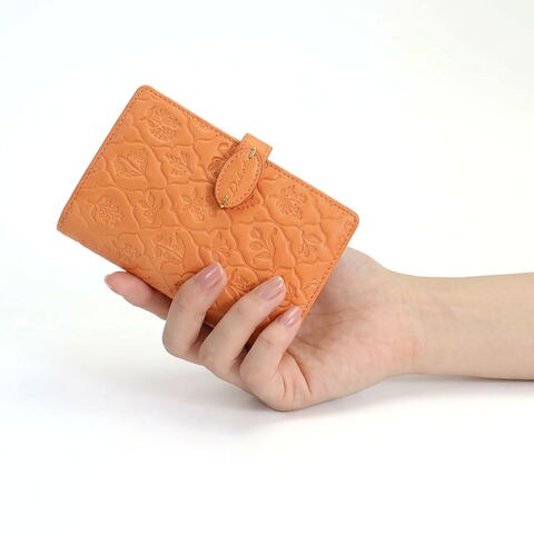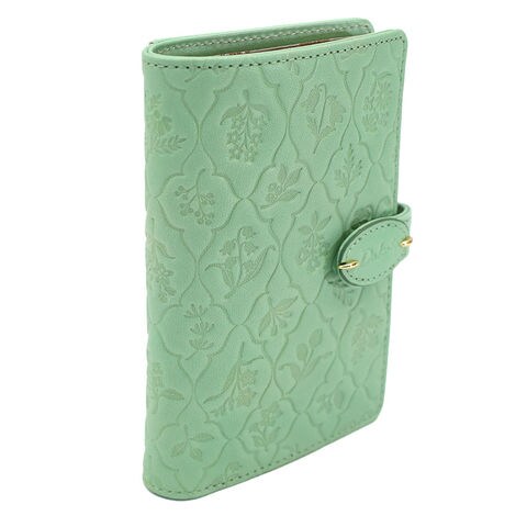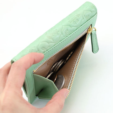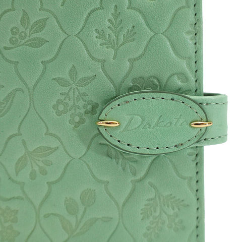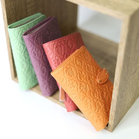 古い植物図鑑をイメージした草花モチーフのエンボス柄を施し、ナチュラルでやさしい印象に仕上げています。素朴で可憐な花柄がさりげなく浮かび上がり、上品な存在感を演出します。さらにゴールドの金具がアクセントとなり、アクセサリーのような華やかさを添えるデザインです。