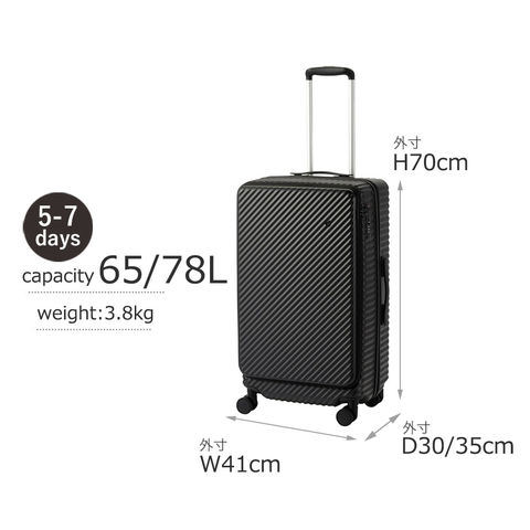エキスパンド機能付きの65/78Lタイプは5~7泊程度の旅行や出張におすすめなサイズです。