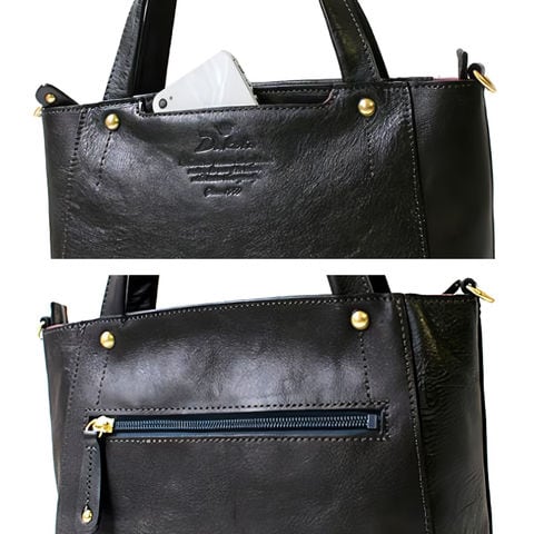 前面のオープンポケットはスマホの収納に便利で背面のファスナーポケットは貴重品を安心してしまえる設計です。内部にはオープンポケットが二つとファスナーポケットが一つあり荷物を整理しながら収納できます。底鋲付きで床置きも安心な毎日頼れる実用的なバッグです。