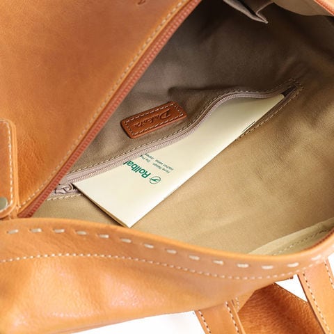 折りたたんだような独特のマチのデザインがクラフト感をより引き立てリュックの表情に深みを与えています。少し斜めに配置された底マチは体に優しくフィットし軽やかな背負い心地を実現します。見た目の可愛らしさと使いやすさを両立したこだわりのディテールです。