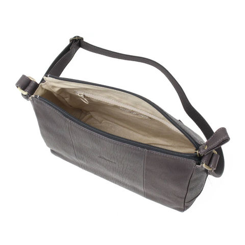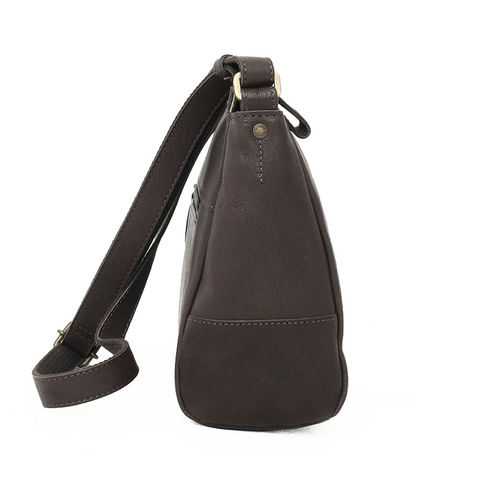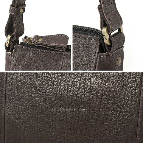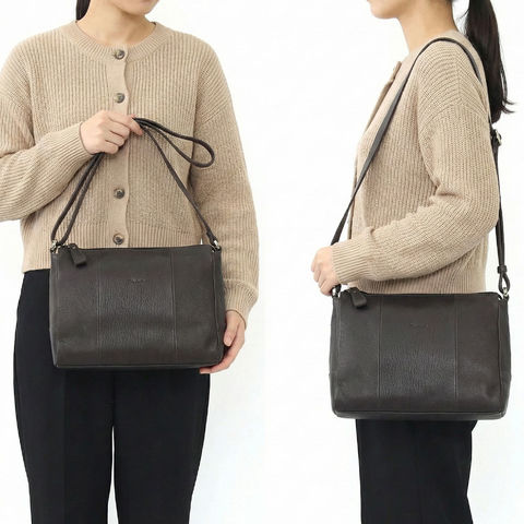 男女問わず使えるシンプルなデザインで、やぎ革の柔らかさを活かしたやさしいフォルムが特徴です。ショルダーは調節金具で微調整が可能で、さりげないブランドロゴとアンティーク調の金具が上品なアクセントになっています。