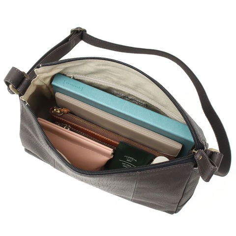 小ぶりな見た目ながら、長財布がしっかり収まるサイズ感です。A5サイズにも対応しており、ハンカチや小物類を入れても余裕があります。コンパクトさと収納力を両立した使いやすい設計です。